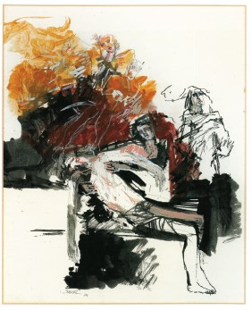 In questa Via crucis del 1936 – per la quale ringraziamo la cortesia della Scuola di Spilimbergo – Cernigoj si muove in ambito sostanzialmente espressionista, ma contiene il movimento e la deformazione delle figure, necessari al tono drammatico della vicenda, entro limiti nettamente calcolati, ulteriormente fermati e resi preziosi dall’uso di cromie nitide e molto raffinate.