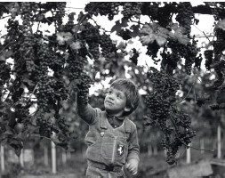 Gianenrico Vendramin ha lasciato importanti testimonianze sulla vita del nostro territorio negli anni ’60/’80 del secolo scorso, e gli scatti esposti a San Vito risalgono per lo più agli anni Settanta del Novecento, quando – osserva il curatore Giancarlo Pauletto - «nel nostro territorio i segni dell’antichissima civiltà contadina non erano ancora del tutto scomparsi e anzi, per la specifica propensione dell’operatore, proprio essi venivano messi particolarmente in evidenza, a contrastarne l’evidente e progressiva sparizione: per testimoniare un tempo che, nella sensibilità del fotografo, si rivestiva certamente della nostalgia di chi era stato bambino negli anni Trenta, e giovane negli anni Quaranta e Cinquanta. Da ciò il tono complessivo di queste foto, un tono elegiaco, coinvolto, simpatizzate e intenerito: senza che questo vada a scapito della sicurezza e della vitalità dell’immagine, che resta in genere pulita e veritiera anche nei casi in cui potrebbe essere una “posa”, cioè un atteggiamento suggerito dall’operatore: ma sarebbero suggerimenti che non fanno altro che rifare la realtà del quotidiano». Ecco dunque in mostra la foto che ritrae nove giovani arrampicati sull’albero, una pratica che per i ragazzi di campagna, era divertimento quotidiano. Ed ecco l’immagine portante della mostra: un bambino sorridente a cavallo di una piccola botte, con la campagna sullo sfondo e, sulla destra, i panni stesi ad asciugare: dalla centralità della sua posizione, padrone dello spazio circostante, il bimbo diventa emblema del tema della mostra. Così come l’altro giovane, “immerso” nella vigna, con i grandi grappoli che lo circondano e verso i quali tende la mano: «anche qui – spiega ancora Pauletto - la centralità della figura è determinante, a stabilire una gerarchia, una sorta di “antropizzazione” del naturale, e però un’antropizzazione assai delicata, il gesto che avvicina il grappolo non è avido, è rispettoso, è quasi un “grazie” detto dal volto appena sorridente».
