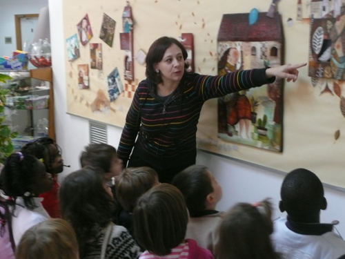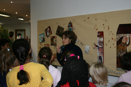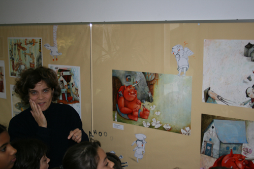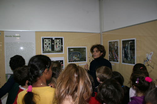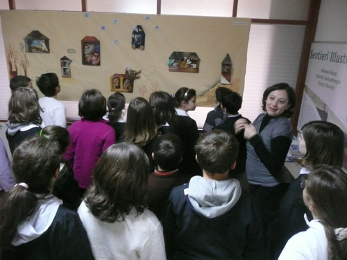 E così sono le tavole di Caterina e Arianna: sono come delle scatole cinesi, si possono vedere in molti modi diversi. Si può partire da un particolare, seguirlo nello spazio della tavola, vedere come si unisce ad un altro in un gioco non casuale, ma perfettamente organico con l’intero che si vuole rappresentare. Emblematico in tal senso è il cielo stellato che formano le tavole del calendario 2009 creato per l’associazione “Il Noce” di Casarsa. Così come sono irresistibili le casette di legno che abitano un villaggio onirico di personaggi altrettanto sognatori, l’uno legato all’altro, ma anche portatore di un piccolo cosmo ricco di colori che suggerisce sempre qualcosa d’altro. Lo sguardo è stimolato a guardare fuori e dentro le finestrelle aperte di queste casette ricche di calore, oggetti, particolari che popolano ogni opera come, probabilmente, sono affollate di figli, oggetti, impegni familiari e non le stesse case delle autrici: quattro figli Caterina, due Arianna. Entrambe hanno uno spazio per lavorare condiviso con loro, dove sul tavolo si mescolano i colori delle illustrazioni con i disegni dei bambini e dei ragazzi di casa.