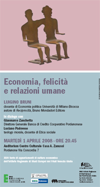 Bruni sarà a Pordenone Martedì 1 aprile per un incontro dibattito sul tema “Economia, felicità e relazioni umane”. Con lui dialogheranno Gianmarco Zanchetta, direttore generale della Banca di Credito Cooperativo Pordenonese e Luciano Padovese, teologo morale, docente di etica sociale.