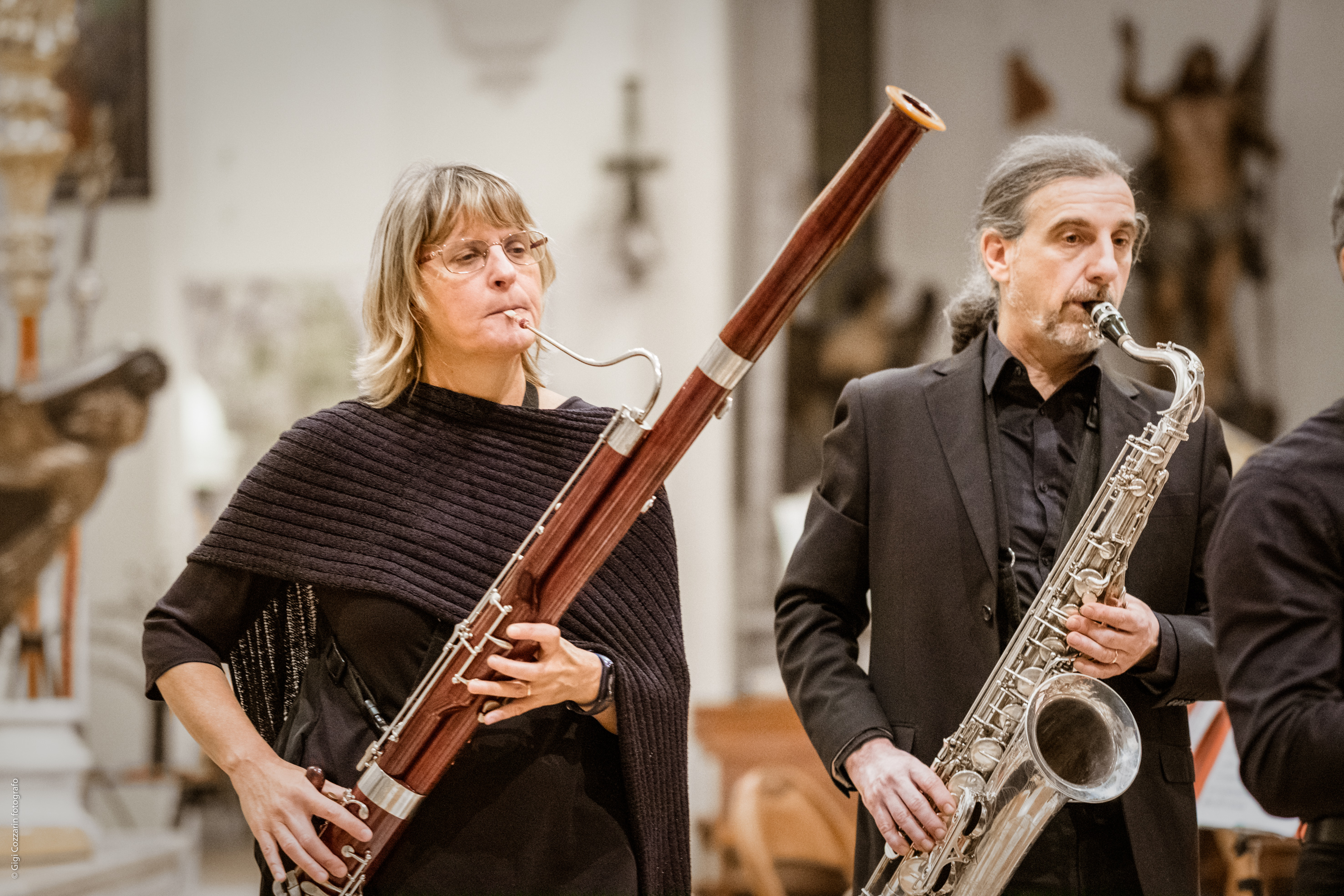 Stockhausen e Bouman si sono piazzati in fondo alla chiesa e lentamente risalendo la navata sono giunti nel transetto eseguendo Moving Sounds, ovvero improvvisazioni a due voci, esempio concreto di quella “musica intuitiva” di cui Stockhausen è un artefice. E così si è goduto del coniugarsi delle voci dei due strumenti in un fluire continuo di note, che potrebbe anche non avere fine. Ma all’improvviso ecco comparire nel transetto gli ottoni delle bande e così prende avvio, senza soluzione di continuità, il pezzo principale: appunto “Sacra risonanza”.